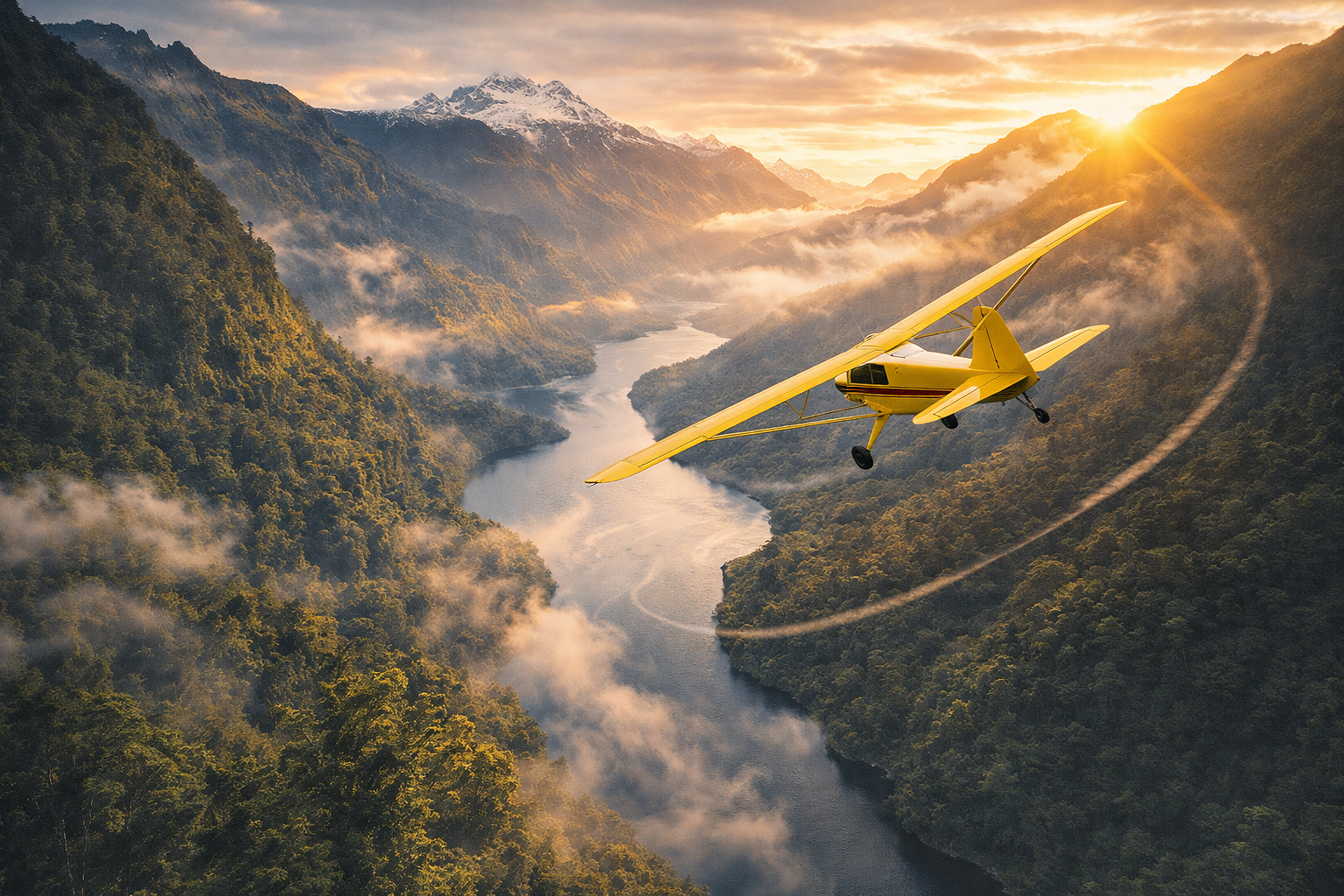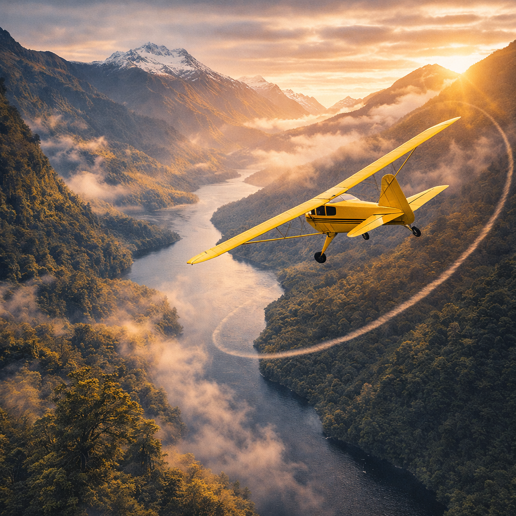 Ride the endless New Zealand skies in the iconic, timeless Piper Cub, chasing golden horizons.