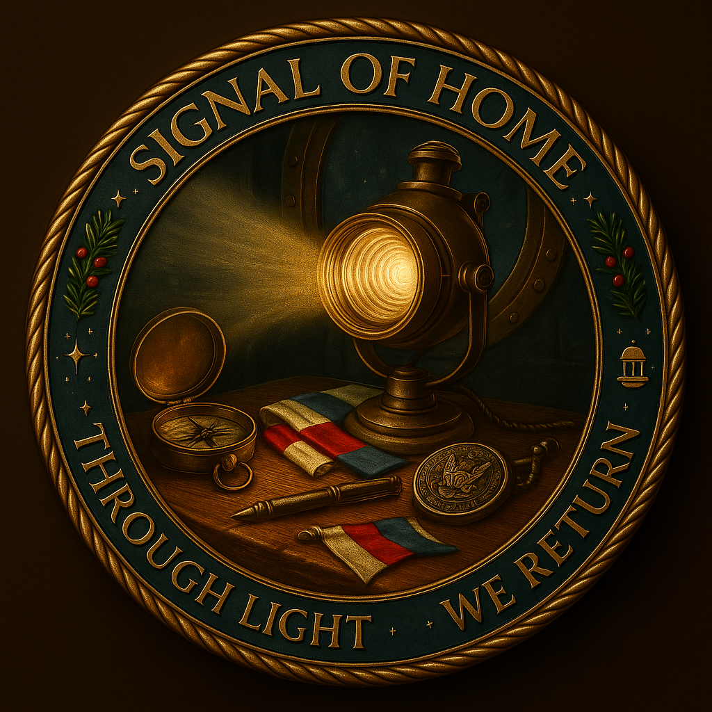 Inscription: “SIGNAL OF HOME • THROUGH LIGHT WE RETURN” — a poetic affirmation of trust, perseverance, and the unbreakable pull of home.
